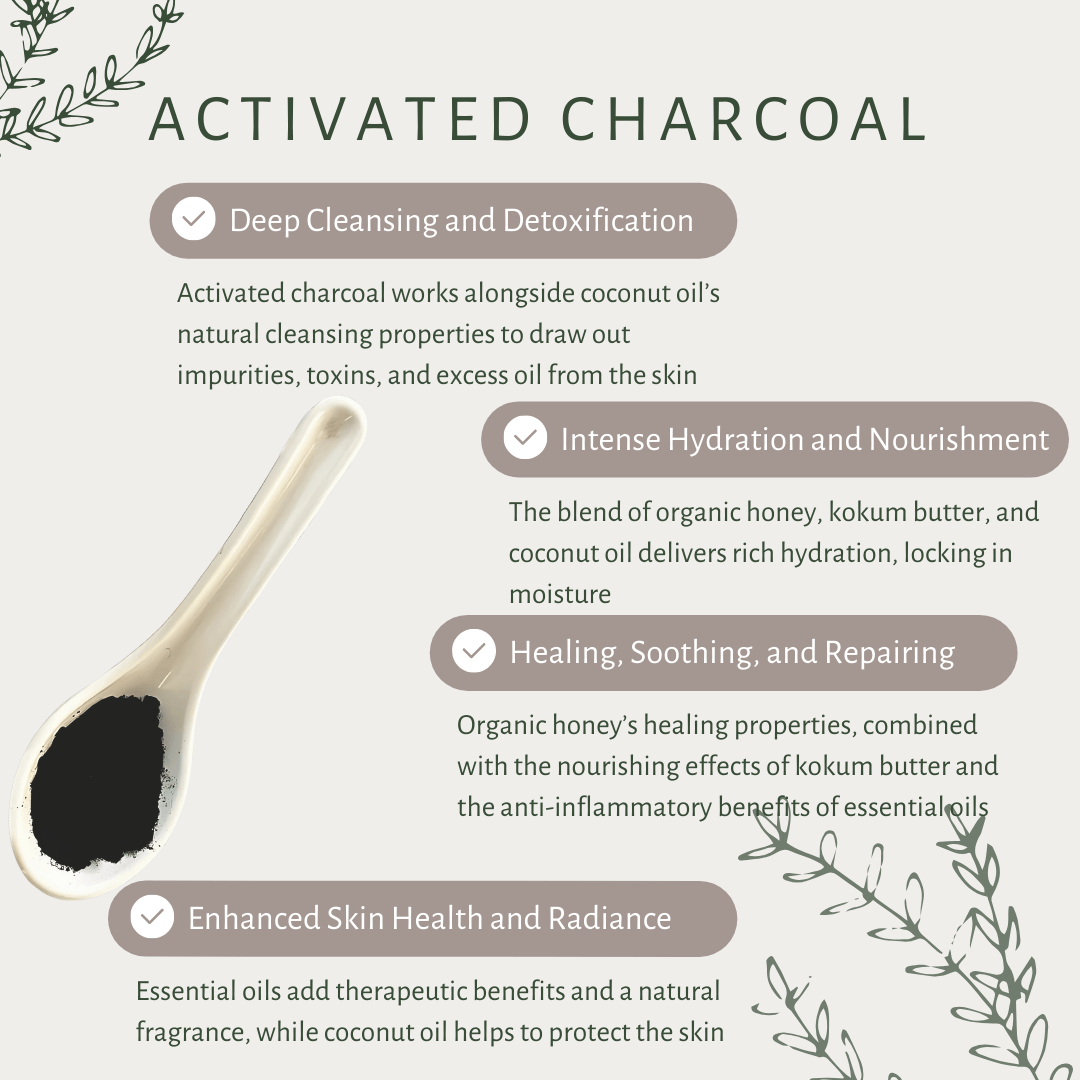 - Deep Cleansing and Detoxification: Activated charcoal works alongside coconut oil’s natural cleansing properties to draw out impurities, toxins, and excess oil from the skin.