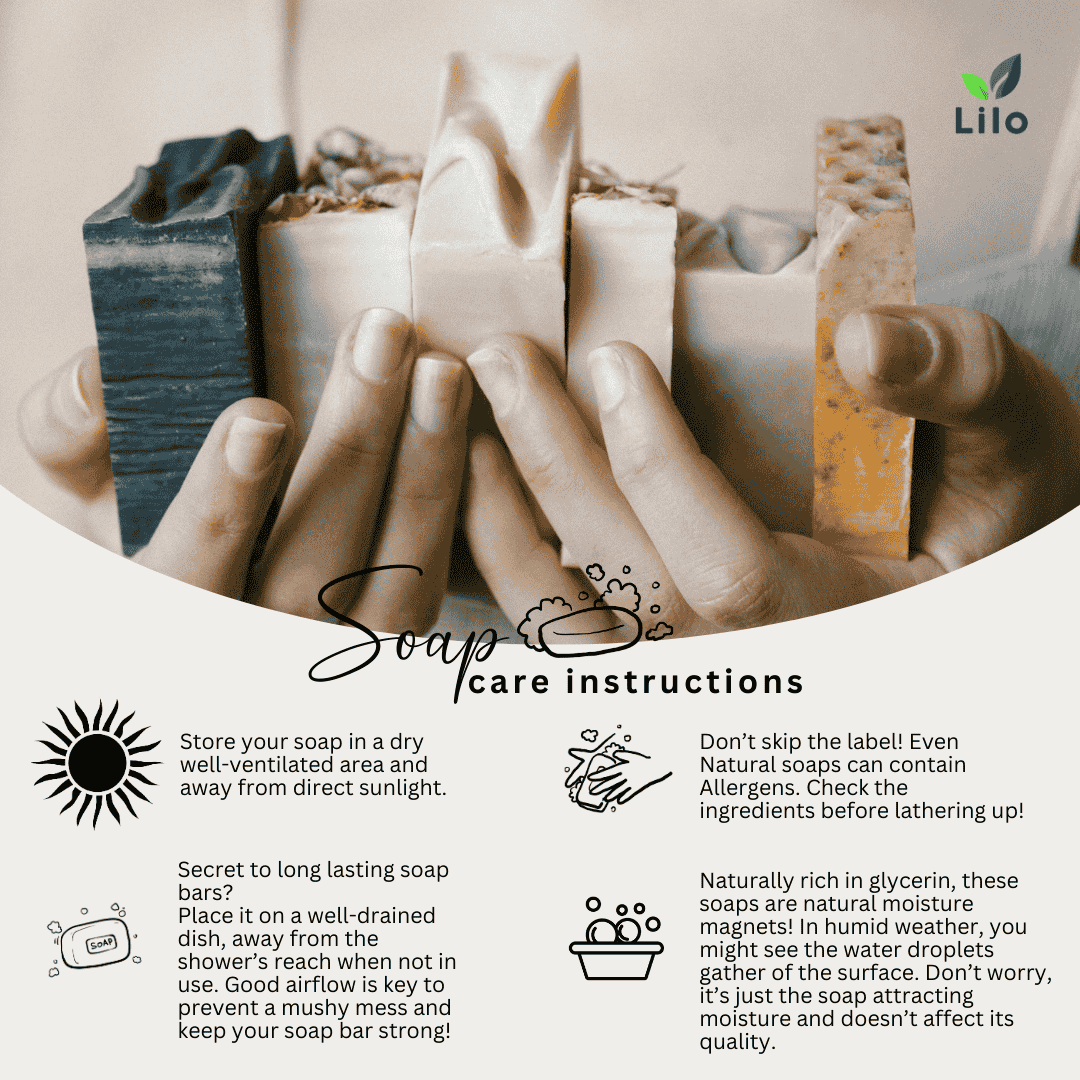 Storage: Keep in cool and dry place. Use a soap dish with drainage to keep the soap dry between uses.