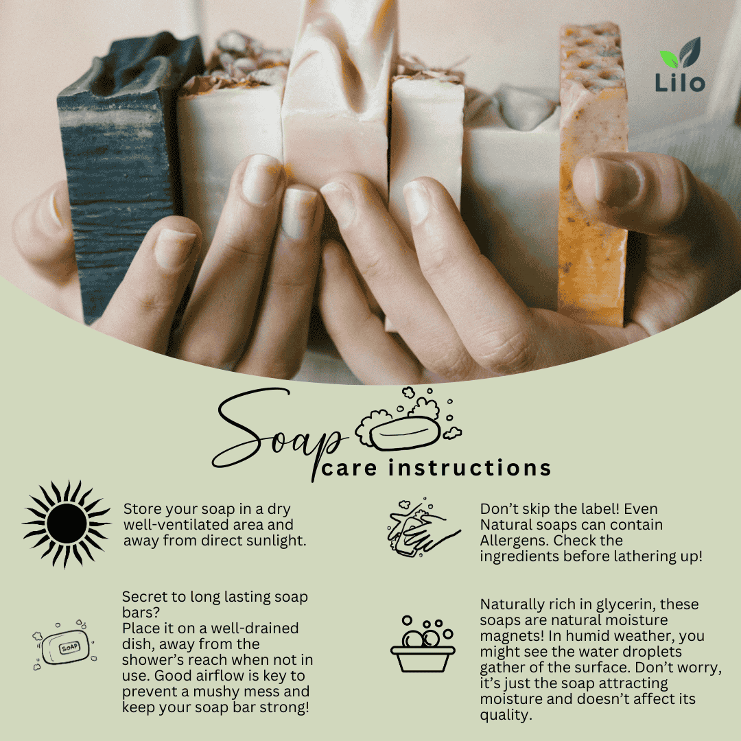 Storage: Keep in cool and dry place. Use a soap dish with drainage to keep the soap dry between uses.