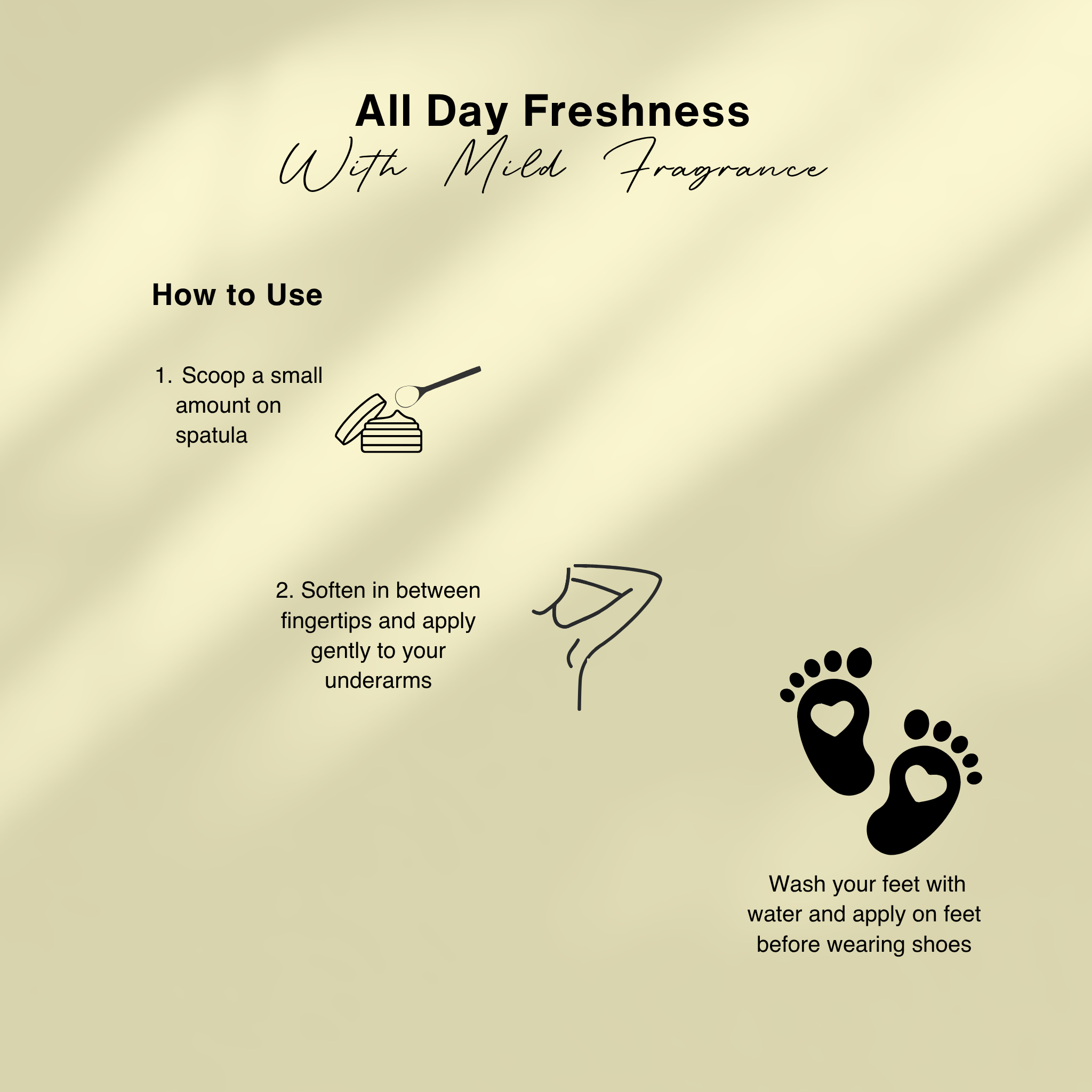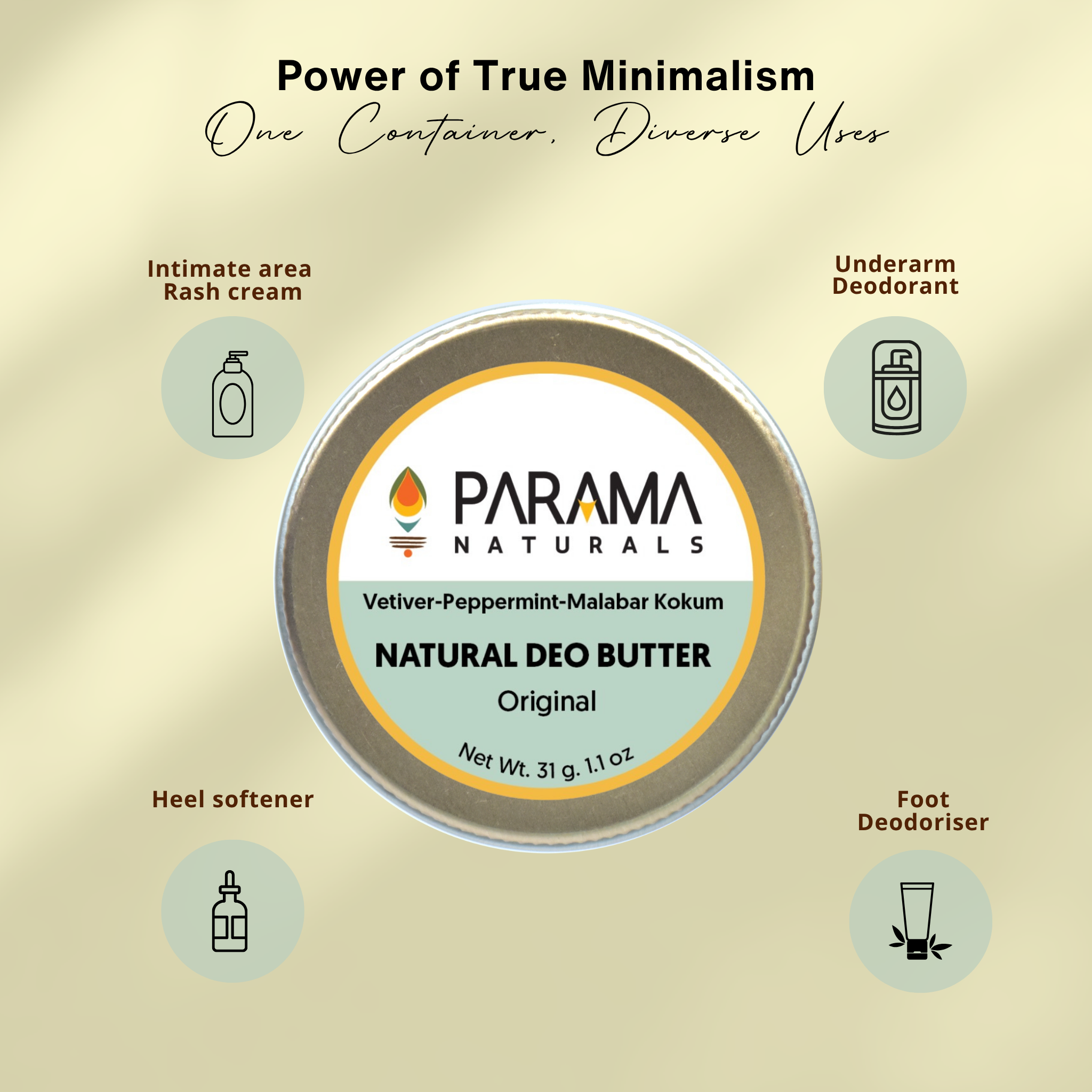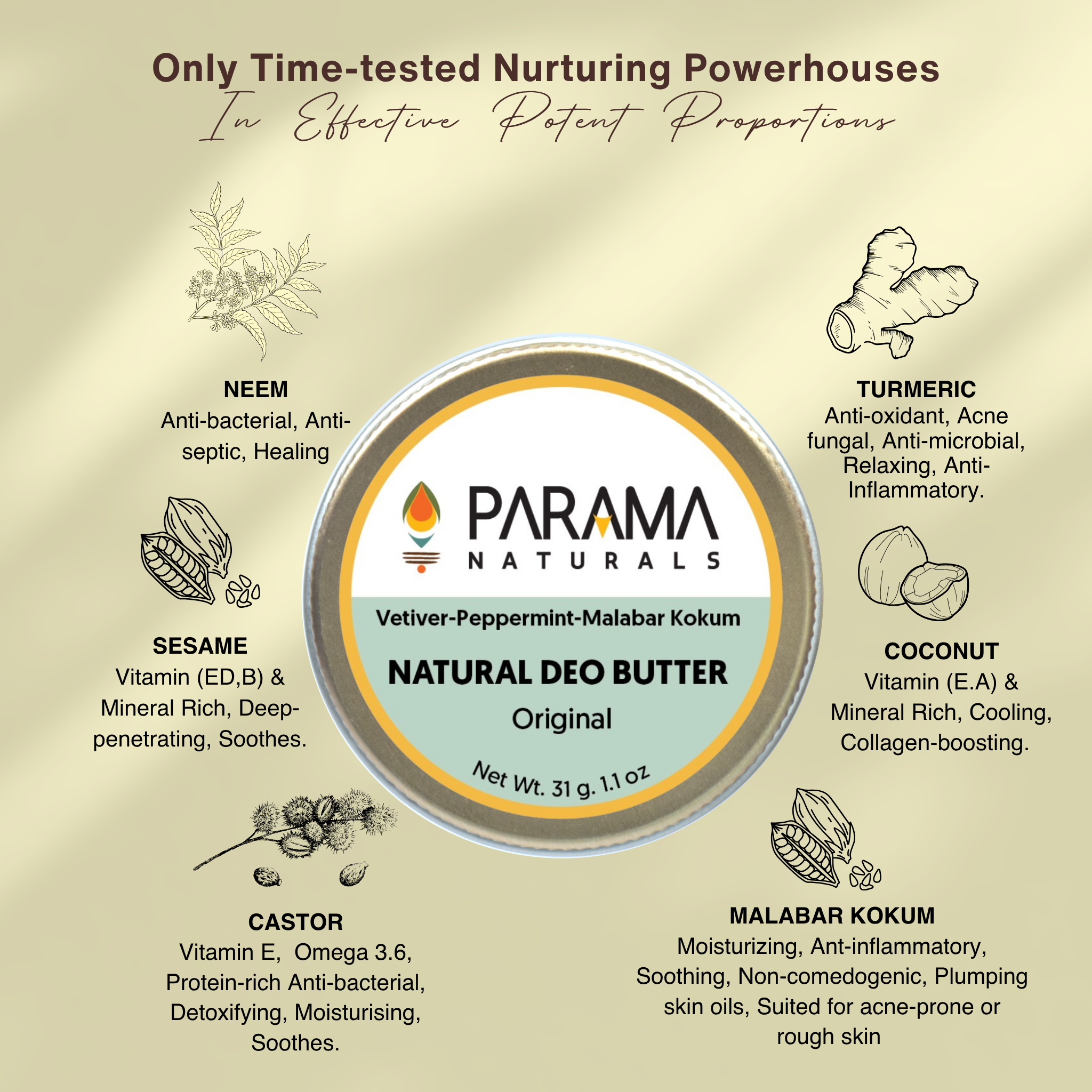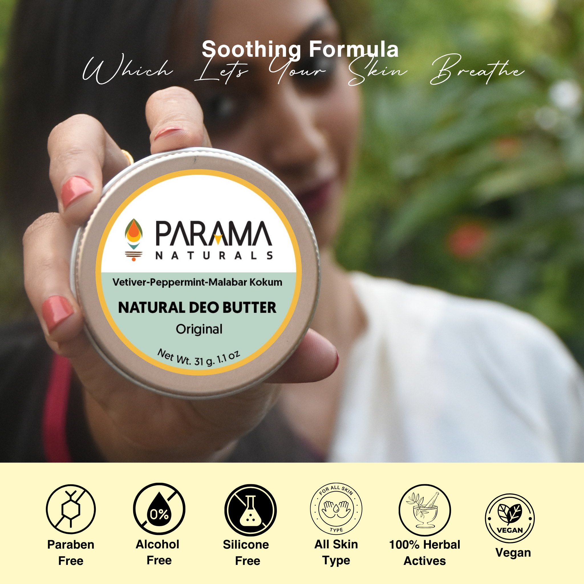 A unique premium-quality, organic and skin-friendly solution for odour protection while keeping your skin soft, smooth and fresh all day, without blocking pores. Formulated with only soothing plant oils and butters of malabar kokum and nutmeg, along with essential oils of herbs and flowers, our Natural Deo Butter (Original) has a naturally mild, rich, relaxing and uplifting aroma of a blend of essential oils to elevate your experience.