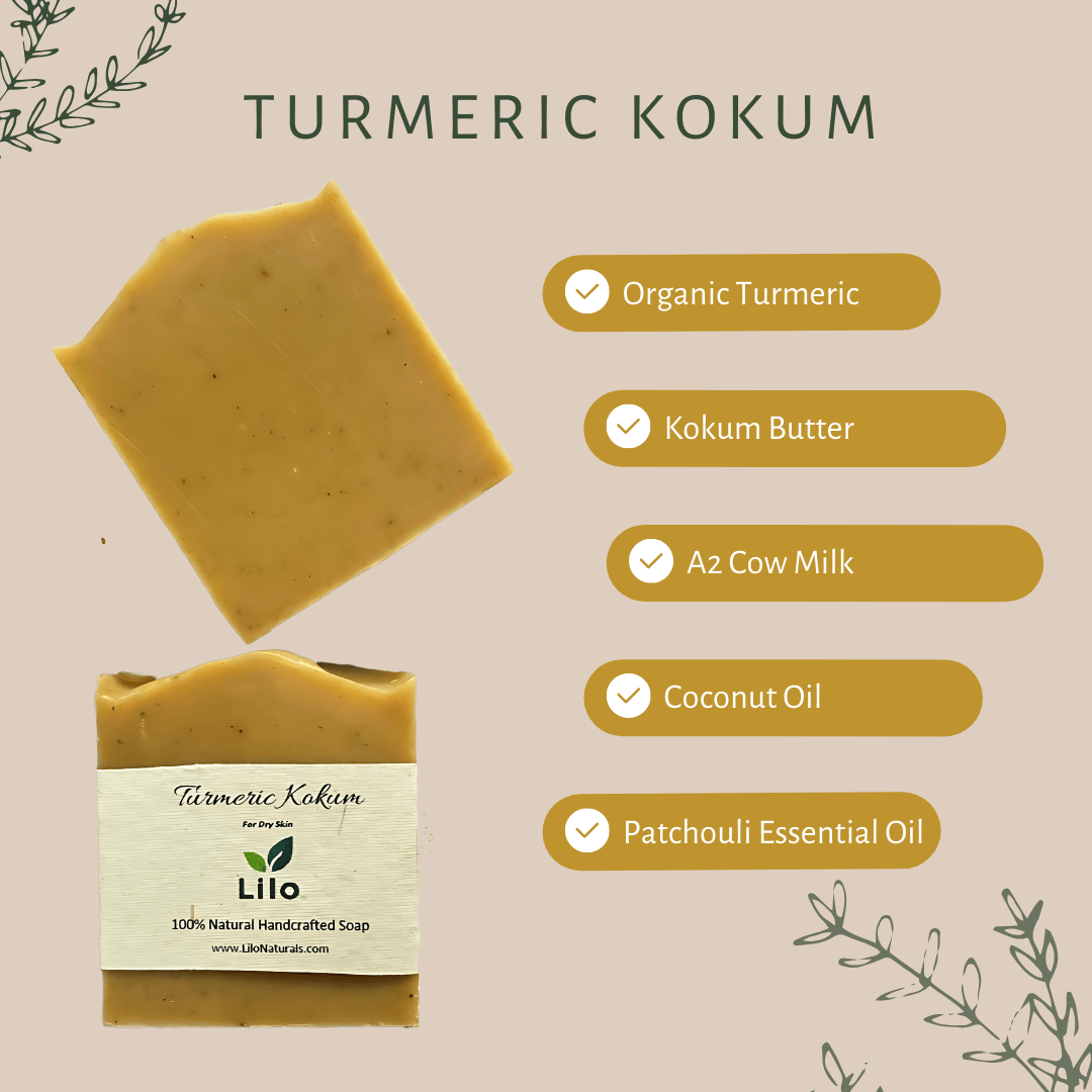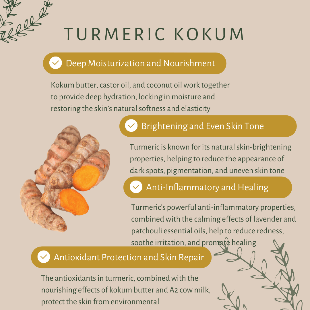 - Antioxidant Protection and Skin Repair: The antioxidants in turmeric, combined with the nourishing effects of kokum butter and A2 cow milk, protect the skin from environmental